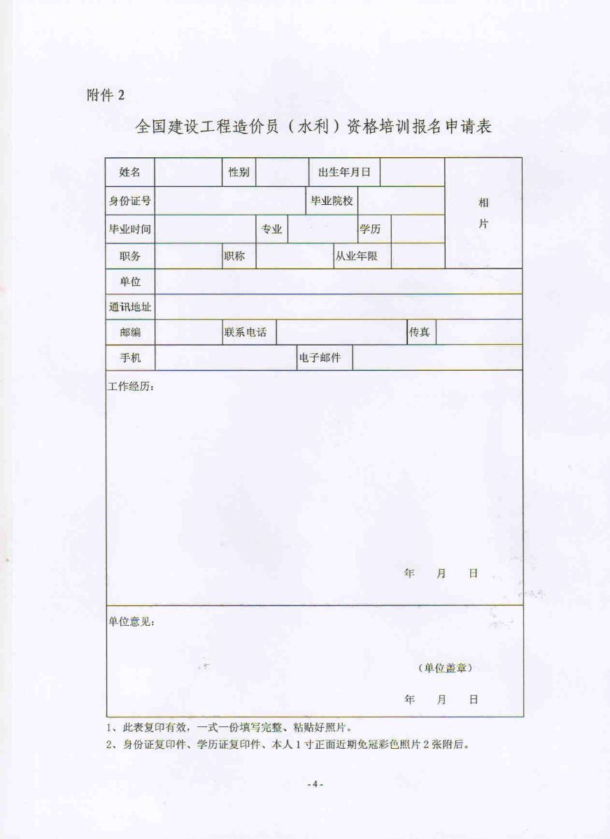 參加培訓(xùn)人員須認(rèn)真填寫《全國(guó)建設(shè)工程造價(jià)員(水利)資格培訓(xùn)報(bào)名申請(qǐng)表》(附件1),報(bào)到時(shí)需攜帶申請(qǐng)表原件(加蓋公章),身份證復(fù)印件、學(xué)歷證書復(fù)印件份(原件報(bào)到現(xiàn)場(chǎng)審核),以及近期1寸彩色免冠照片2張。