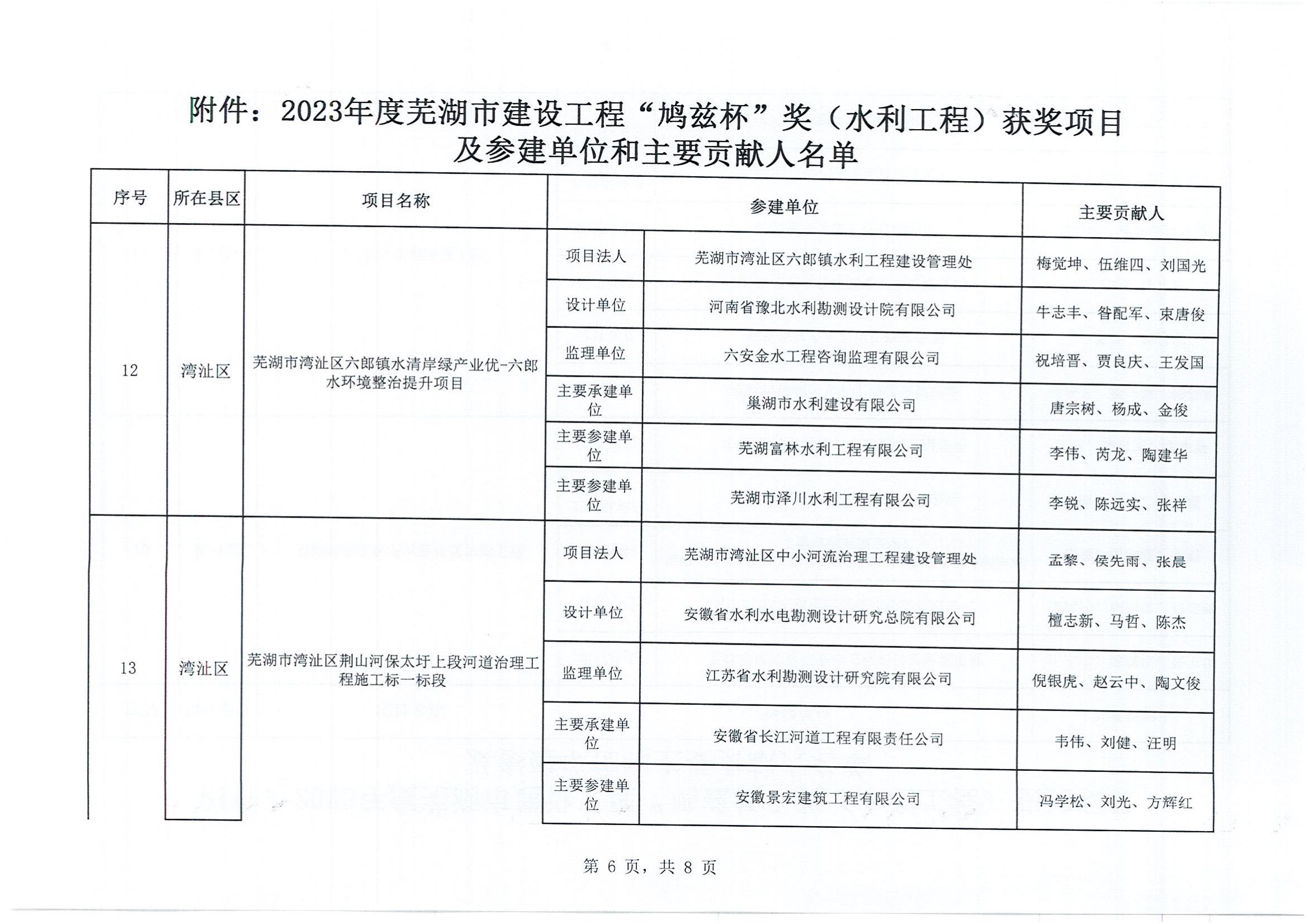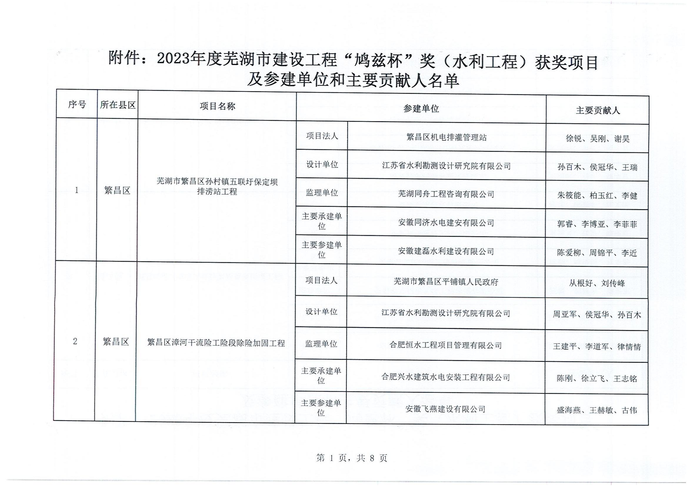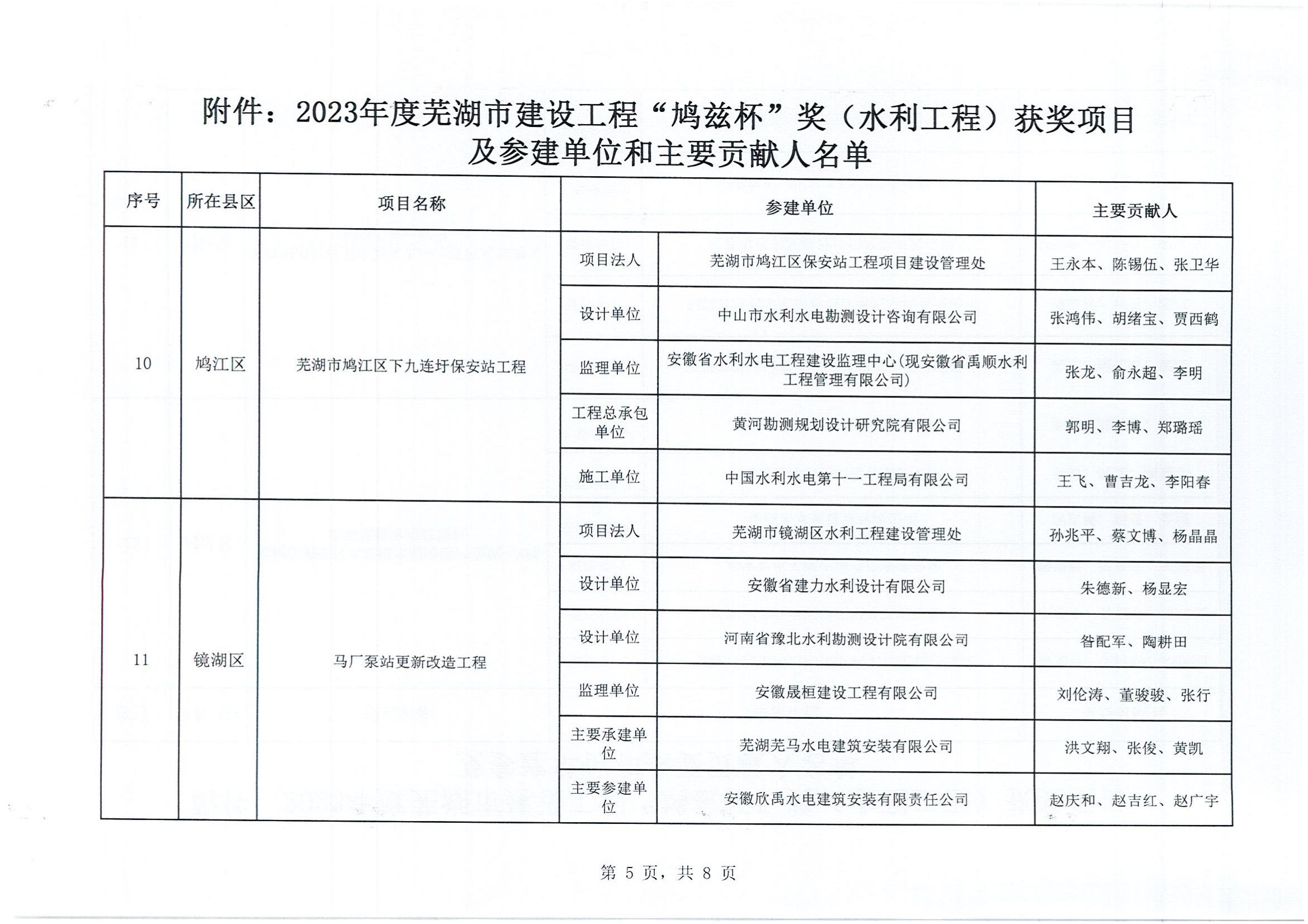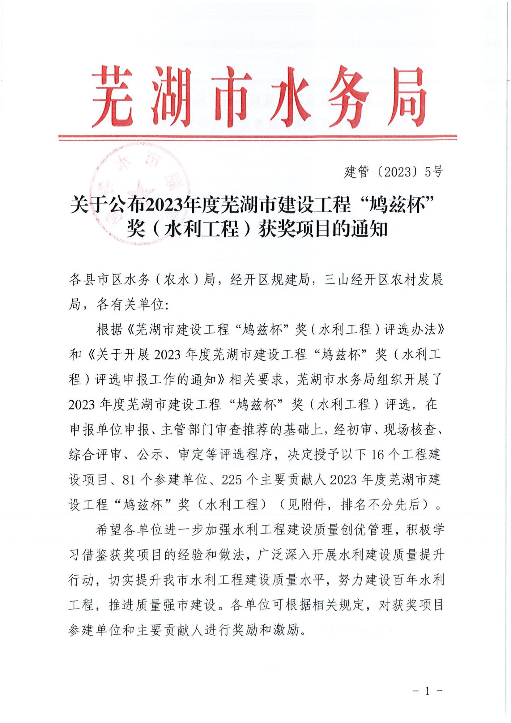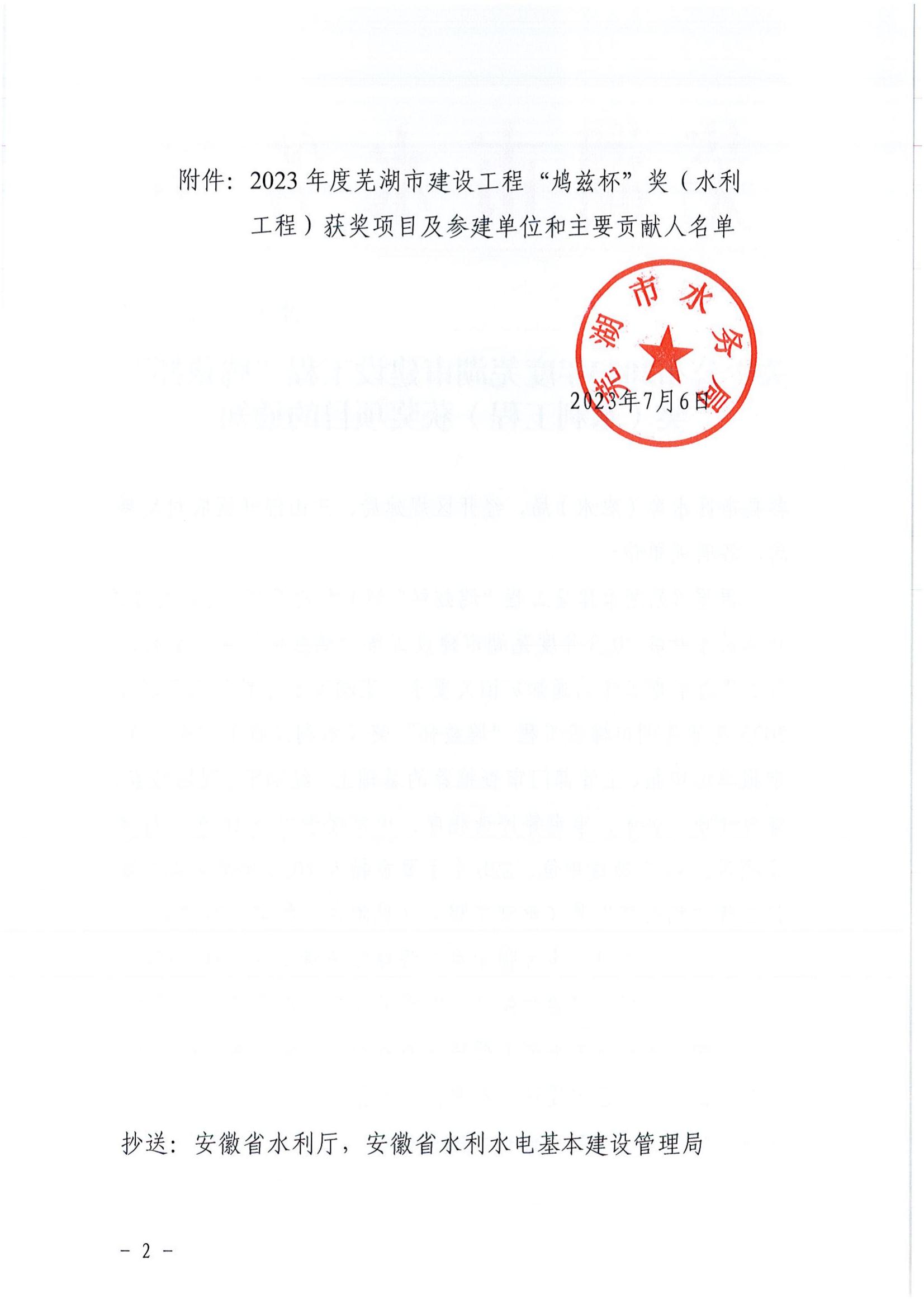 轉(zhuǎn)發(fā)關(guān)于公布2023年度蕪湖市建設(shè)工程“鳩茲杯”獎(jiǎng)(水利工程)獲獎(jiǎng)項(xiàng)目的通知