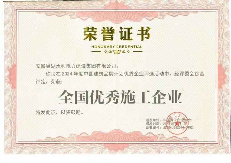 2024年度全國優(yōu)秀施工企業(yè)證書