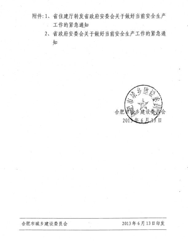 在巢各建設、施工和監理企業,局屬有關單位:?xml:namespace> 現將《合肥市城鄉建設委員會轉發省政府安委會和省住建廳關于做好當前安全生產工作的緊急通知》(合建質安[2013]64號)轉發給你們,請結合合肥市城鄉建委《關于進步加強建設工程安全生產監督管理工作的若干意見》(合建[2013]31號)文要求和當前開展的安全生產“百日整治”行動,進步提高認識,認真抓好落實。 附: 附件:1.合肥市城鄉建設委員會轉發省政府安委會和省住建廳關于做好當前安全生產工作的緊急通知 2.安徽省住房城鄉建設廳轉發省政府安全生產委員會關于做好當前安全生產工作的緊急通知 3.安徽省政府安全生產委員會關于做好當前安全生產工作的緊急通知 巢湖市住房和城鄉建設局 2013年7月8日 安徽省住房城鄉建設廳轉發省政府安全生產委員會關于做好當前安全生產工作的緊急通知 皖建質明電〔2013〕17號 為深入貫徹全國、全省安全生產電視電話會議精神,深刻汲取近期發生的安全生產事故教訓,舉反三,警鐘長鳴,常抓不懈,時刻繃緊安全生產這根弦,切實抓好當前建設安全生產工作,現將省政府安全生產委員會《關于做好當前安全生產工作的緊急通知》(皖安明電〔2013〕2號)轉發給你們,并提出如下要求,請并貫徹執行。 、進步提高做好當前住房城鄉建設系統安全生產工作端重要性的認識,全面落實安全生產責任 各級住房城鄉建設主管部門要牢固樹立科學發展、安全發展理念,堅持“安全第、預防為主、綜合治理”的方針,進步加強組織導,堅決克服麻痹松懈情緒,增強做好安全生產工作的緊迫感和責任感,全面落實安全生產責任。 二、突出重點,立即開展安全生產大檢查 各級住房城鄉建設主管部門要突出重點,特別是要針對建設系統行業域安全生產工作的特點,結合當前“打非治違”和“安全生產月” 等活動,立即部署開展次安全生產大檢查,全面徹底排查治理事故隱患。 1、建筑施工:深入開展以高大模板、深基坑、腳手架、垂直起重機械等重大危險源為重點的專項整治工作。要強化高大模板專家論證、過程驗收、日常監管等工作,切實抓好邊坡基坑支護等防坍塌措施,進步加強對腳手架、塔吊基礎硬化、排水措施的監督巡查,持續抓好臨邊洞口、施工用電防護等安全措施。繼續開展“打非治違”專項治理行動,嚴厲打擊非法違法工程。 2、城市道路、橋梁:立即開展對既有城市道路、橋梁的隱患排查,加強對城市橋梁的整體結構安全性、安全護欄以及自動扶梯等重點環節、部位的監督檢查,并通過此次大檢查建立健全城市道路、橋梁日常檢測維修的長效機制。 3、燃氣、供水:加強對燃氣、供水企業的日常巡查監督工作,確保城市生命線工程的正常運營,督促企業完善應急預案,定期開展應急演練。 4、風景名勝區:各風景名勝區管委會要做好節假日期間景區內火災隱患排查治理工作,加強對應急疏散通道的檢查,保證游客應急通道暢通。結合“安全生產月”活動,在景區內積開展安全宣傳活動。 5、城市軌道交通:加強對城市軌道交通工程防坍塌措施的檢查,以及做好對基坑支護、周邊建筑物沉降的實時監控,并完善各項安全應急措施。 三、加強督查和處罰力度,切實增強安全監管工作實效 各級住房城鄉建設主管部門要加強監督檢查,推進各項安全工作落實到位,對排查出的安全隱患采取“零容忍”措施,該停工的律停工、該停產的律停產、該處罰的律處罰。要做到切隱患歸零后,方可投入生產。要充分利用“安全生產月”活動的有效載體,廣泛宣傳“強化安全基礎,推動安全發展”的主體,宣傳典型,加大對違法行為、典型事故案例、重大事故隱患的曝光力度,形成社會監督的強大合力,促進安全生產形勢持續穩定好轉。 安徽省住房和城鄉建設廳 2013年6月9日 關于做好當前安全生產工作的緊急通知 (皖安明電〔2013〕2號) 各市人民政府,省直有關部門: 為貫徹全國、全省安全生產電視電話會議精神,深刻汲取近期發生的重特大生產安全事故教訓,舉反三,警鐘長鳴,常抓不懈,時刻繃緊安全生產這根弦,深入有效地開展全國第十二個“安全生產月”活動,切實做好當前安全生產工作,確保人民群眾生命財產安全,促進全省安全生產形勢持續穩定好轉。現就有關事項通知如下: 、高度重視,全面落實安全生產責任 各地區、各有關部門和單位要牢固樹立科學發展、安全發展理念,堅持“安全第、預防為主、綜合治理”的方針,進步加強組織導,層層落實安全責任,堅決克服麻痹松懈情緒,增強做好安全生產工作的緊迫感和責任感。各地區要強化對安全生產形勢的分析研判,根據地區環境特點和氣候變化等因素,針對重點、難點問題,采取果斷措施,嚴格事故防范。各級行業主管部門要切實落實行業監管責任,加強對本行業域安全生產工作的指導與監管。各類生產經營單位要全面落實安全生產主體責任,切實加強安全管理。 二、突出重點,立即開展安全生產大檢查 各地區、各有關部門和單位要突出重點,針對不同行業域、不同地區、不同企業的特點,結合當前“打非治違”和“安全生產月”活動等工作,立即組織開展次安全生產大檢查,全面徹底排查治理事故隱患。 ()煤礦:要認真吸取近期多起煤礦瓦斯爆炸事故的教訓,深入推進瓦斯綜合治理,切實落實“四位體”防突措施,加大隱患排查治理力度。